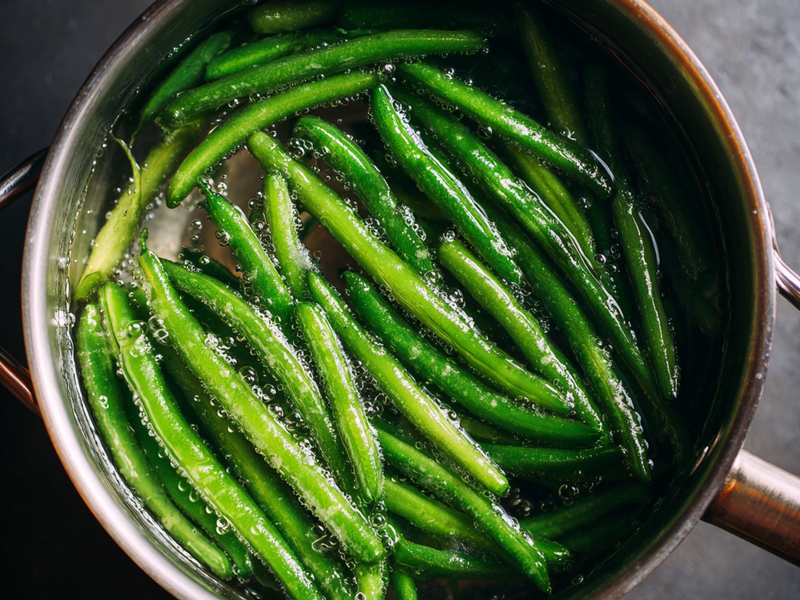 Step 1: Blanch the green beans in salted boiling water until bright green.