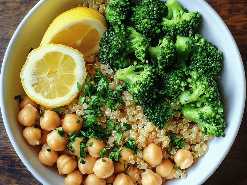 Mix olive oil, lemon juice, and garlic into quinoa.