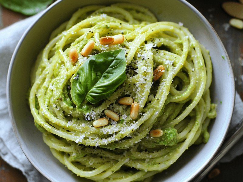 9.Avocado Pesto Pasta with Toasted Pine Nuts