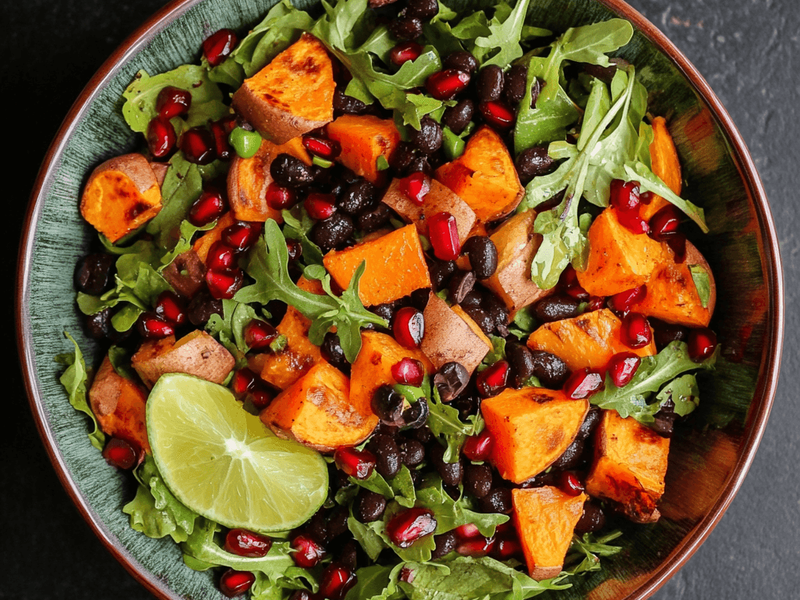Sweet, earthy, and bright! Roasted sweet potatoes, black beans, and juicy pomegranate arils tossed in a zingy lime dressing.