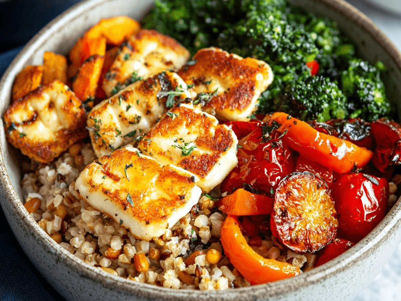 Golden, squeaky halloumi cheese paired with roasted vegetables and hearty grains, drizzled with lemon-herb vinaigrette. Salty, tangy, and satisfying!
