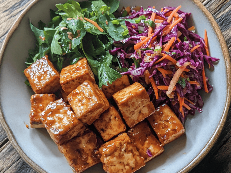 Crispy tofu tossed in a creamy, spicy peanut butter sauce, served with a crunchy cabbage slaw for balance.