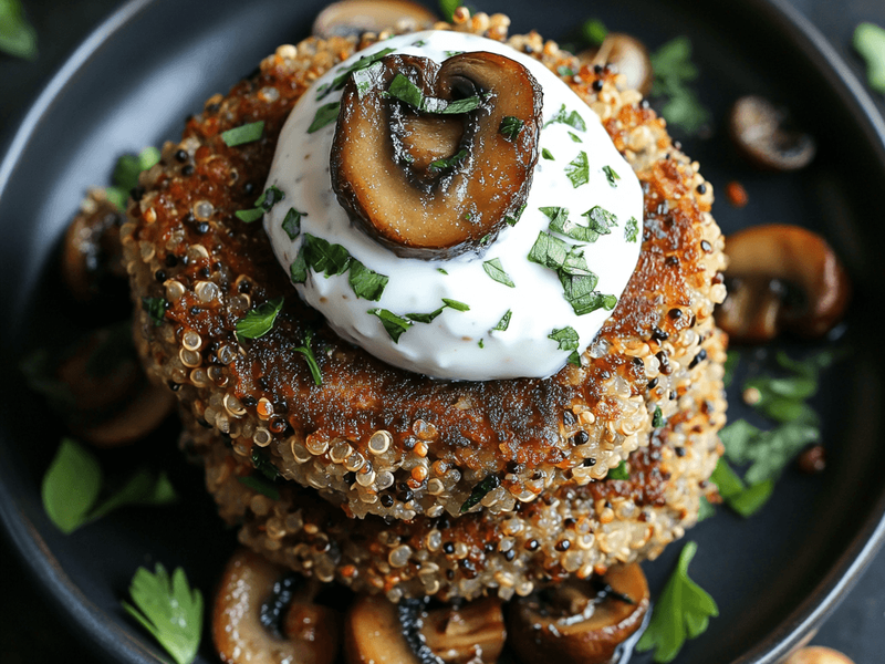 Savory patties made with quinoa, mushrooms, and caramelized onions. Serve with a dollop of herbed yogurt for a creamy finish.