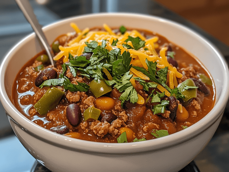 A hearty and comforting dish packed with vegetables, beans, and ground turkey. This chili is perfect for meal prep and keeps well in the fridge all week.