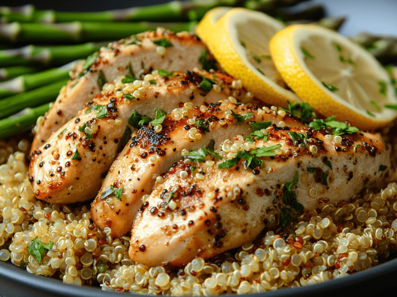 10.Lemon Garlic Herb Chicken with Quinoa and Asparagus