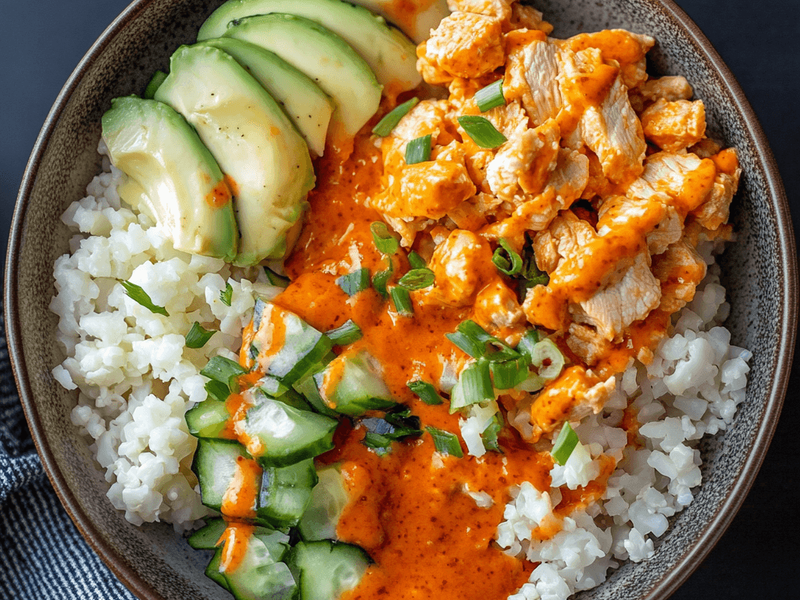 3. Assemble bowls with cauliflower rice, veggies, and buffalo chicken, then drizzle with ranch.