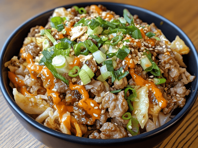 All the flavors of a classic egg roll without the hassle of frying. This bowl is filled with ground pork, cabbage, and a delicious soy sauce-based dressing.