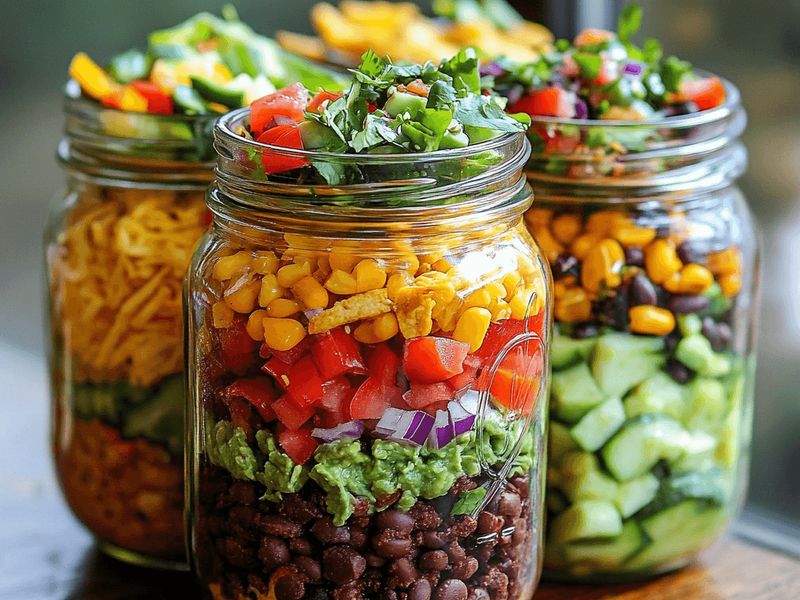 2. Layer the ingredients in jars, starting with salsa and ending with shredded cheese.