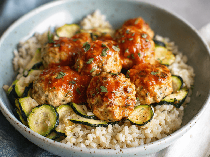 Description: Juicy turkey meatballs blended with zucchini for added moisture and nutrients, served with rice.
