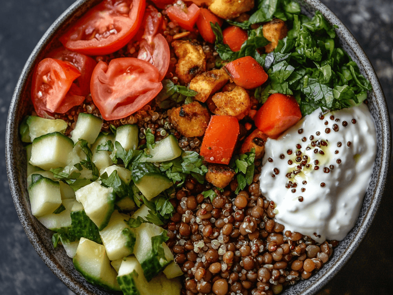 A nutrient-dense bowl loaded with fiber and complete protein from lentils and quinoa.