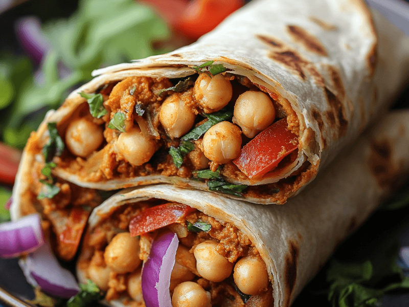 Spiced chickpeas in a whole-grain wrap with creamy hummus and crunchy veggies.