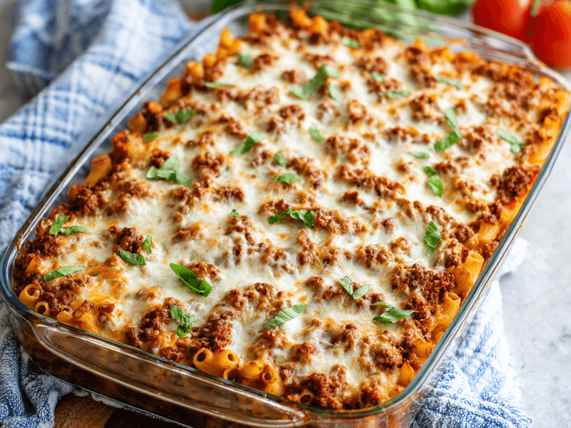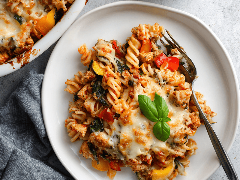 Description: A cheesy pasta bake with extra veggies blended into the sauce.