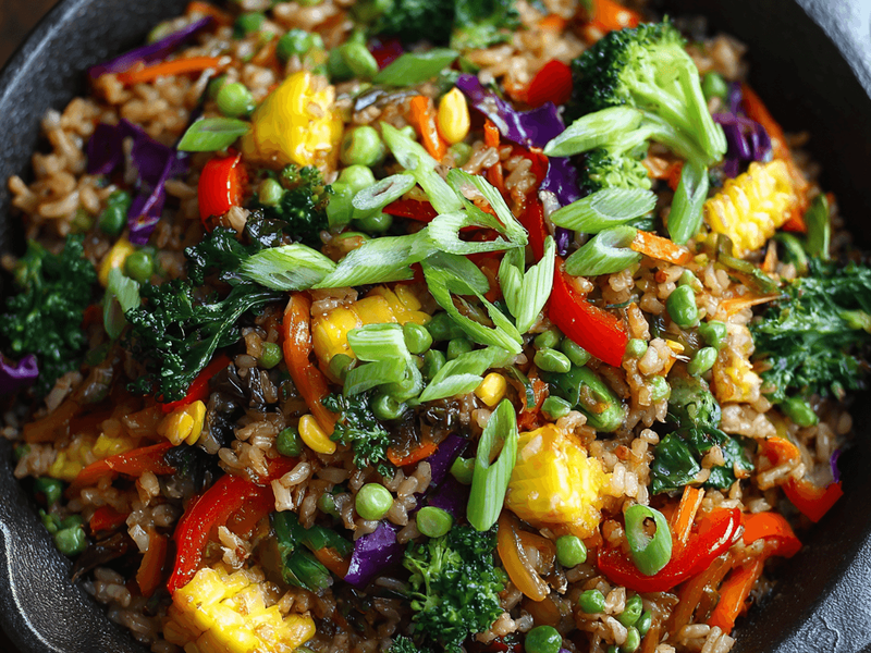 2. Sauté veggies, add rice and sauce, stir in eggs.