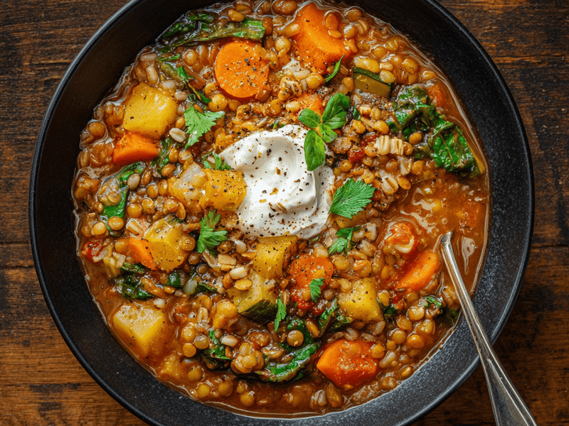 - Ingredients: Lentils, pearl barley, carrots, celery, onions, broth.