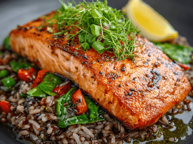 - Ingredients: Salmon fillets, brown rice, broccoli, sesame seeds.
