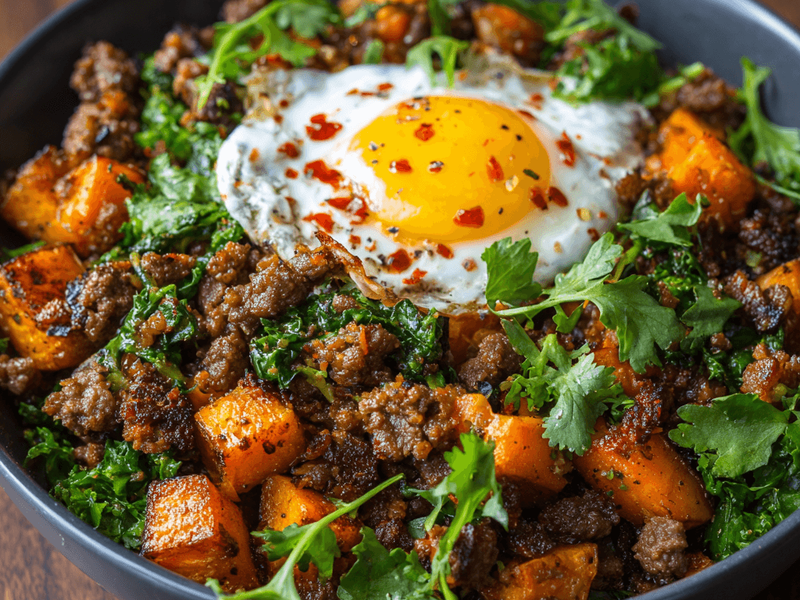 - Ingredients: Lean ground beef, cubed sweet potatoes, onion, spinach.