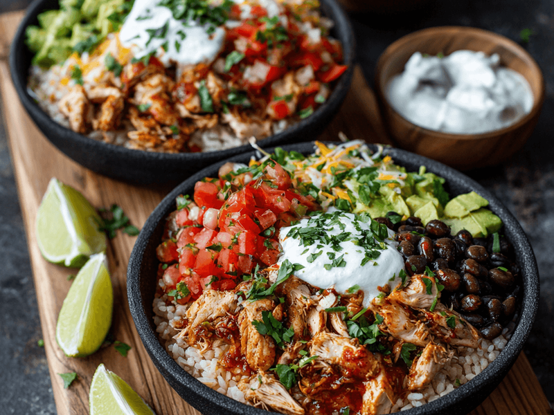 - Ingredients: Brown rice, grilled chicken, black beans, corn, salsa, avocado.