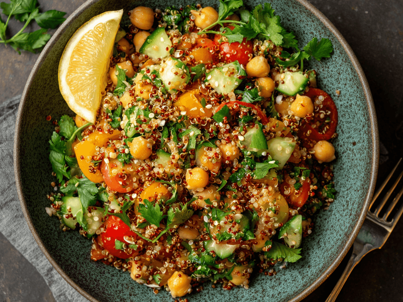 - Ingredients: Quinoa, chickpeas, cucumber, cherry tomatoes, olive oil, lemon juice.