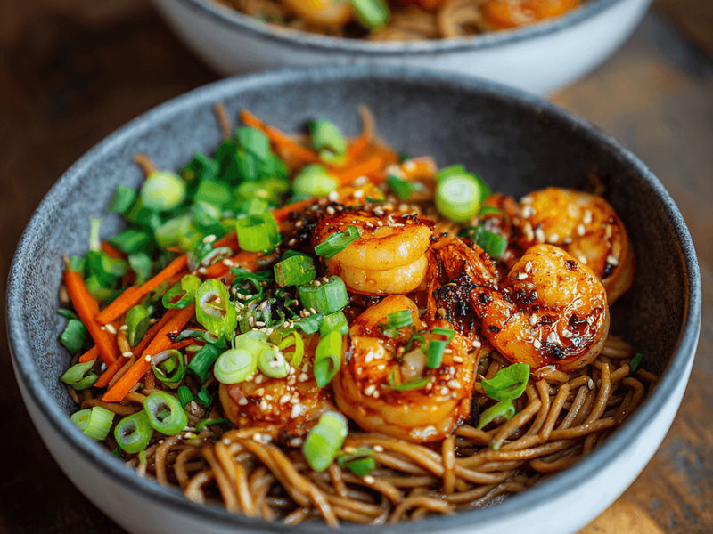 - Ingredients: Whole wheat noodles, shrimp, snow peas, garlic, soy sauce.