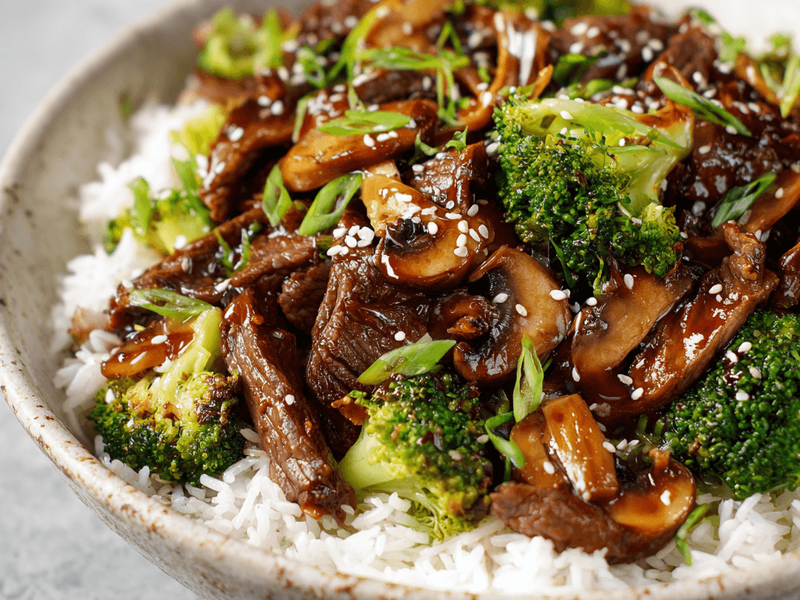 - Ingredients: Lean beef strips, white rice, mixed veggies, teriyaki sauce.