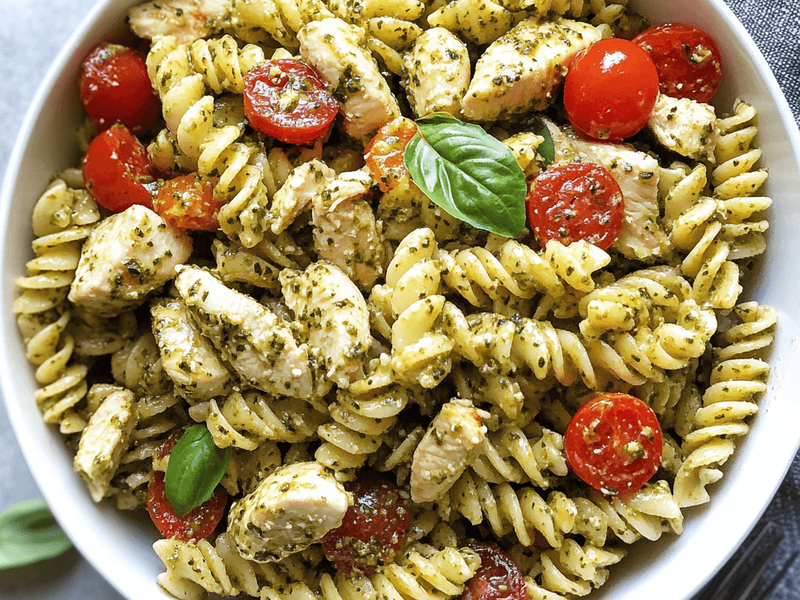1. Toss cooked pasta, chicken, tomatoes, and pesto.