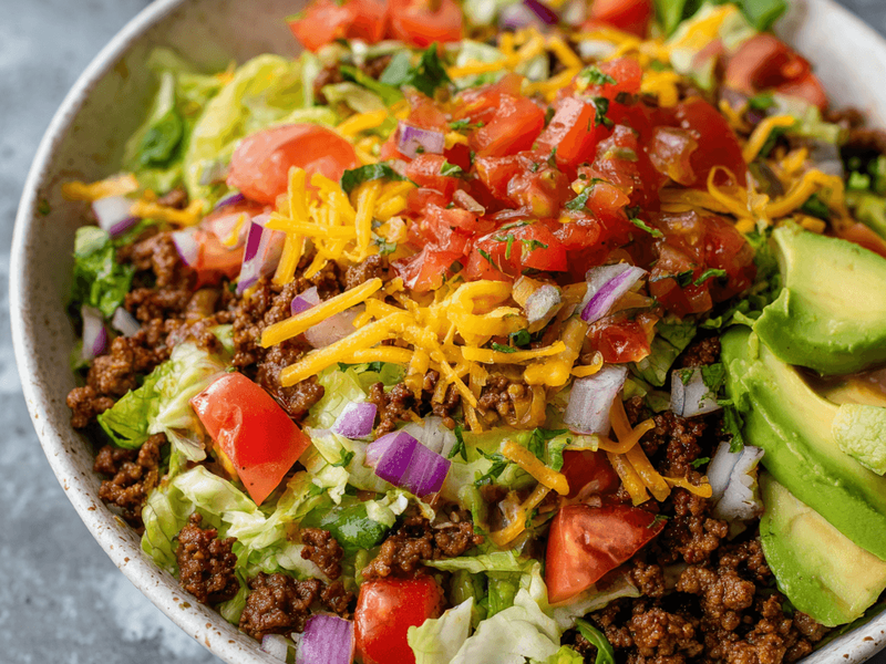 2. Assemble bowls with lettuce, beef, avocado, and cheese.