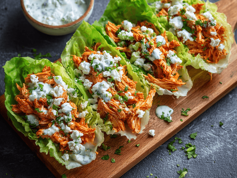 1. Cook chicken, shred, and toss with melted butter + hot sauce.