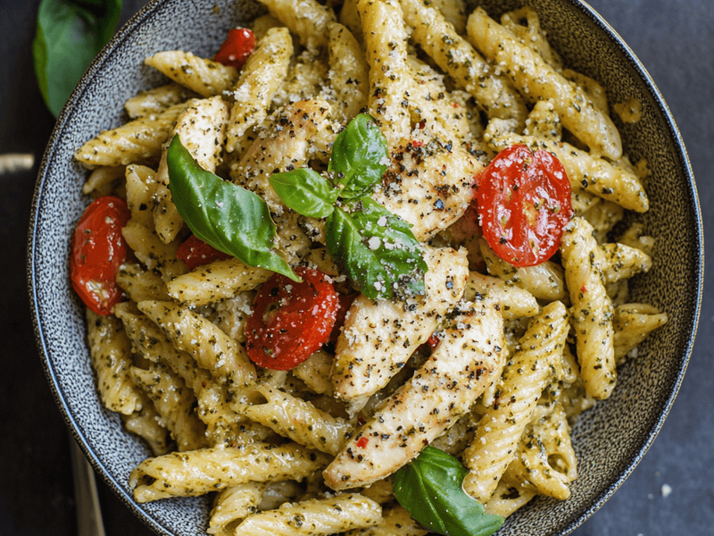 A comforting bowl of pasta with juicy chicken and herby pesto—no baking, no fuss.
