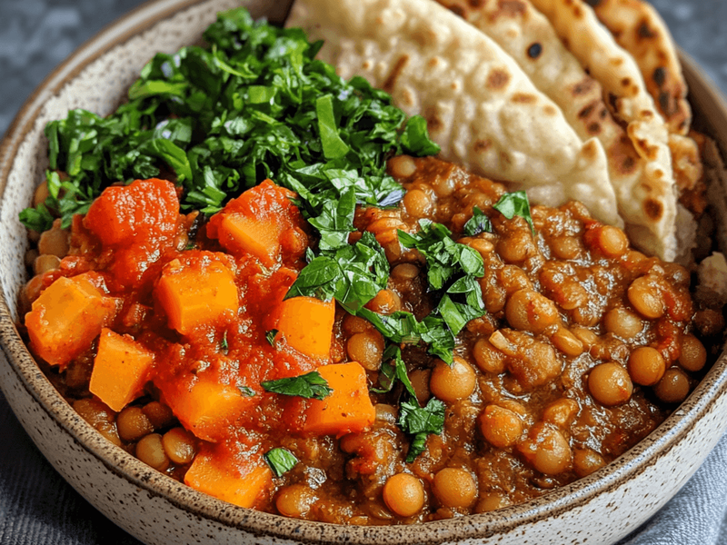 This hearty vegan stew uses red lentils for a fast-cooking protein boost.