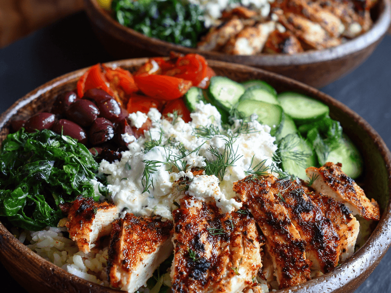 - Ingredients: Chicken breast, lemon, oregano, cucumber, tomato, feta (optional).