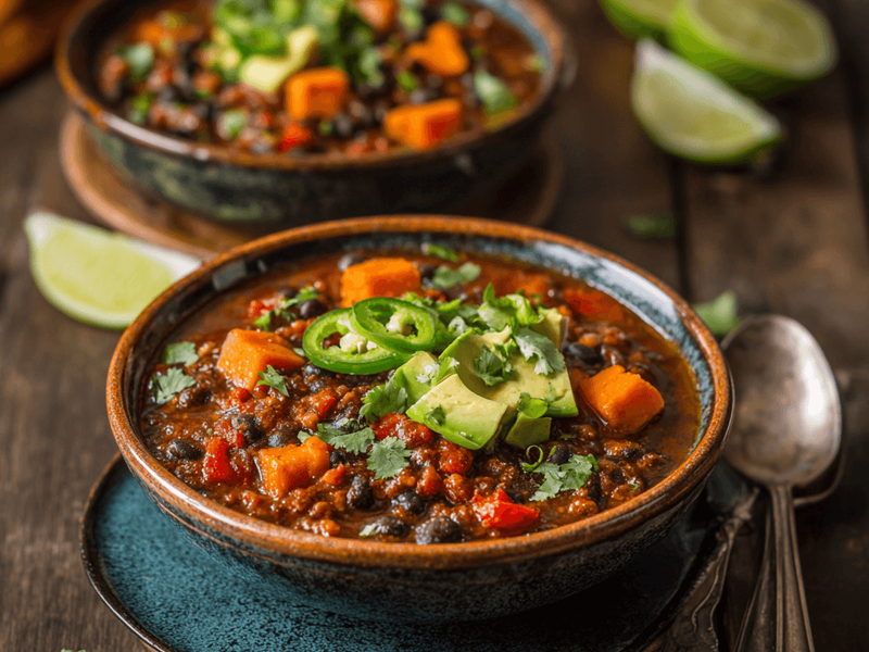 - Ingredients: Black beans, sweet potato, tomatoes, onion, cumin, chili powder.