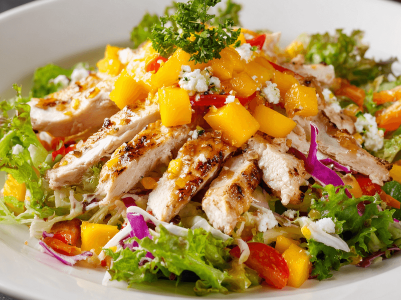 - Ingredients: Chicken breast, mango, red onion, cilantro, lime juice.