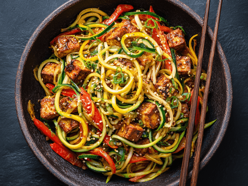 - Ingredients: Zucchini noodles, tofu, bell peppers, carrots, soy-ginger sauce.