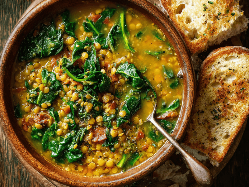 - Ingredients: Lentils, spinach, carrots, celery, garlic, cumin.
