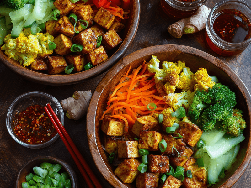 - Ingredients: Rice noodles, crispy tofu, bell peppers, carrots, spicy peanut sauce.