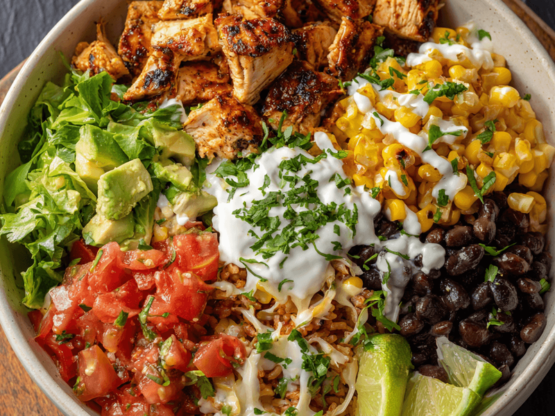 - Ingredients: Brown rice, grilled chicken, black beans, corn, pico de gallo, avocado.