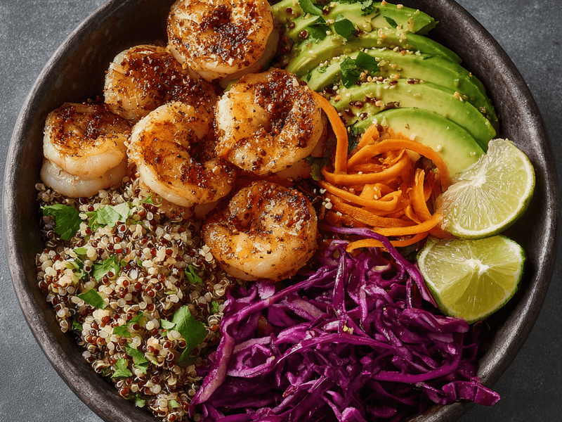 - Ingredients: Farro or quinoa, shrimp, avocado, arugula, cherry tomatoes, lime dressing.