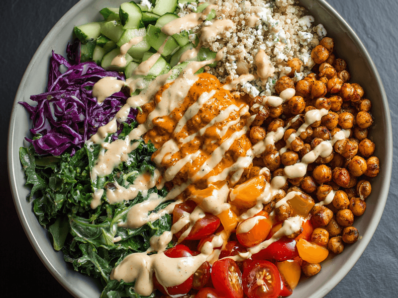 - Ingredients: Brown rice, roasted chickpeas, roasted sweet potatoes, kale, tahini dressing.
