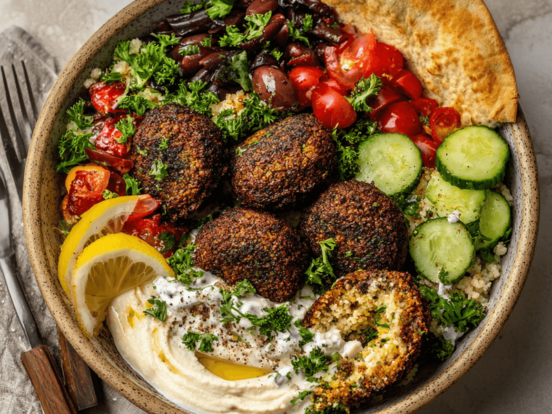 - Ingredients: Quinoa, falafel, cucumber, cherry tomatoes, olives, hummus, tzatziki.