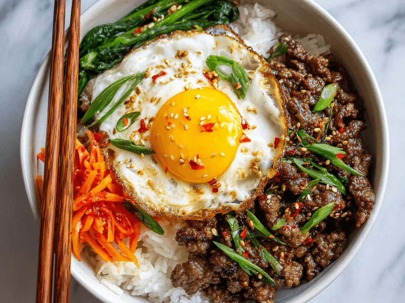 - Ingredients: White rice, thinly sliced beef, soy sauce, garlic, sesame oil, sautéed spinach, kimchi.