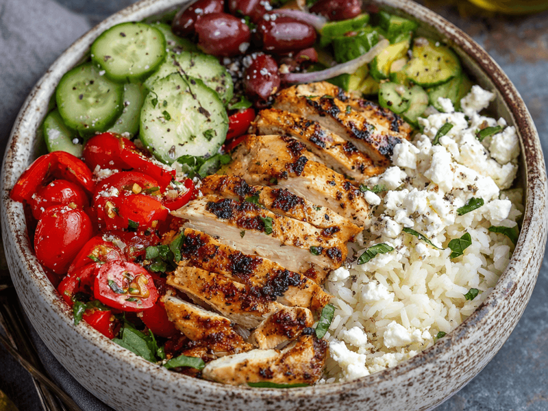 - Ingredients: Couscous, grilled chicken, cucumber, tomato, olives, feta, lemon dressing.