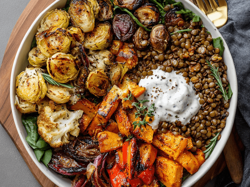 - Ingredients: Lentils, roasted carrots, cauliflower, Brussels sprouts, tahini-lemon dressing.