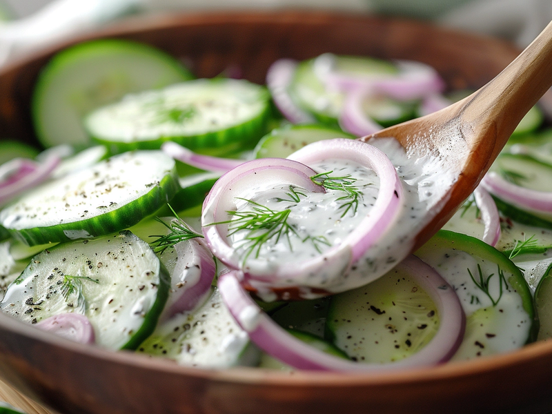 If you want a more classic deli-style flavor, you can swap Greek yogurt for sour cream for an even richer, more traditional creamy cucumber salad. To make it heartier and more colorful, add halved cherry tomatoes or thinly sliced radishes for extra crunch. If you prefer a lighter version, skip the mayo entirely and use a little more Greek yogurt, thinning it with a small splash of water or lemon juice until it reaches the texture you like.