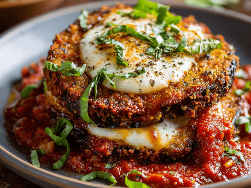 - Ingredients: Breaded eggplant, mozzarella, marinara, cooked lentils (mixed into sauce).