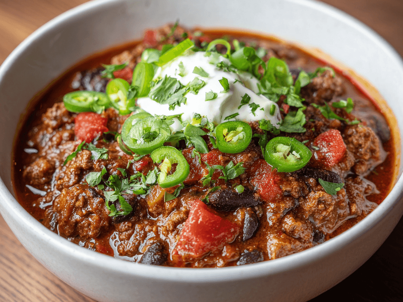 - Ingredients: Ground bison, kidney beans, tomatoes, onion, chili spices.