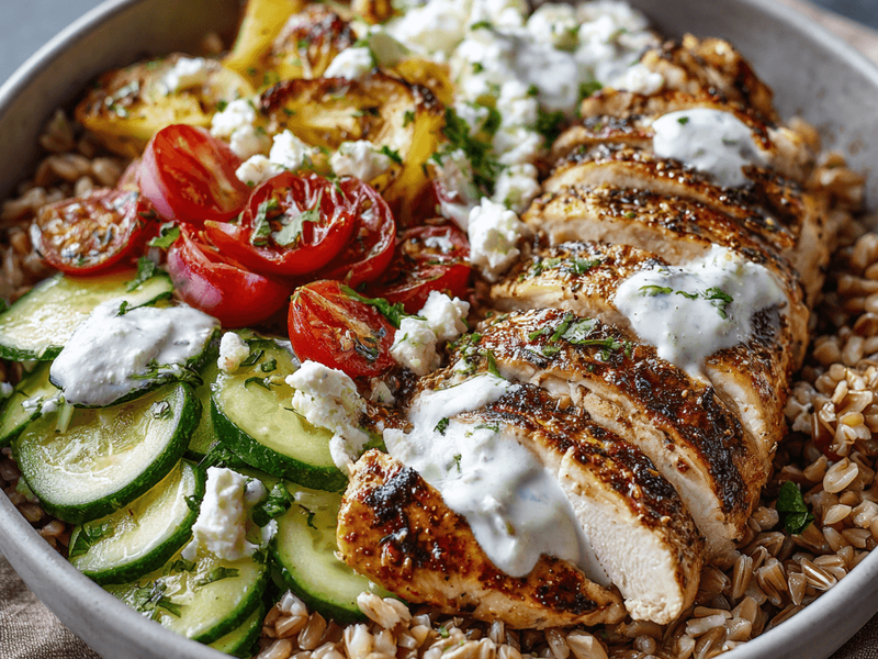 - Ingredients: Grilled chicken breast, farro, cucumber, tomato, olives, tzatziki.