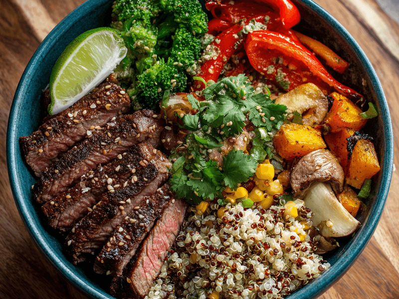 - Ingredients: Sirloin steak, quinoa, roasted zucchini, mushrooms, olive oil.