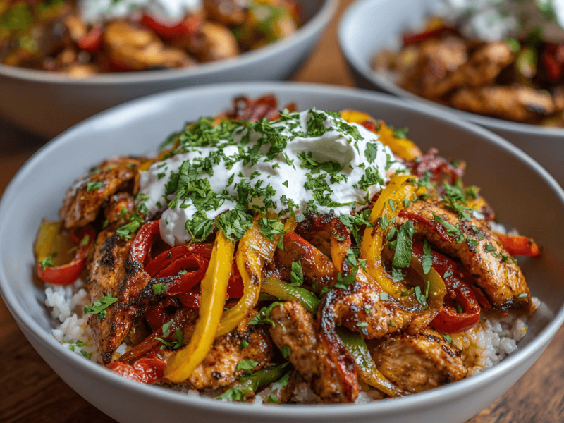 - Ingredients: Chicken breast, bell peppers, onions, fajita seasoning, black beans, brown rice.