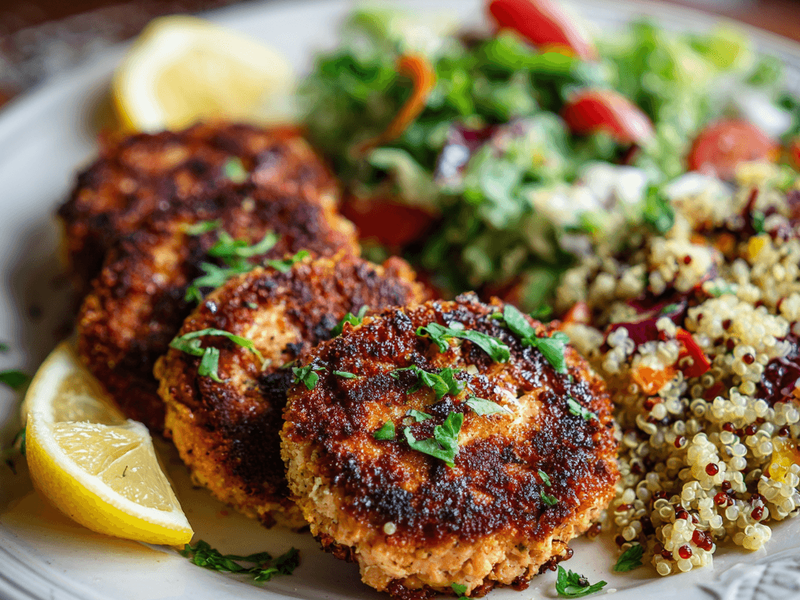 - Ingredients: Canned salmon, egg, breadcrumbs, dill, quinoa, cucumber, tomato.