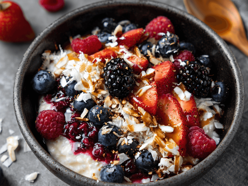 - Ingredients: Cottage cheese, strawberries, blueberries, chia seeds, honey.